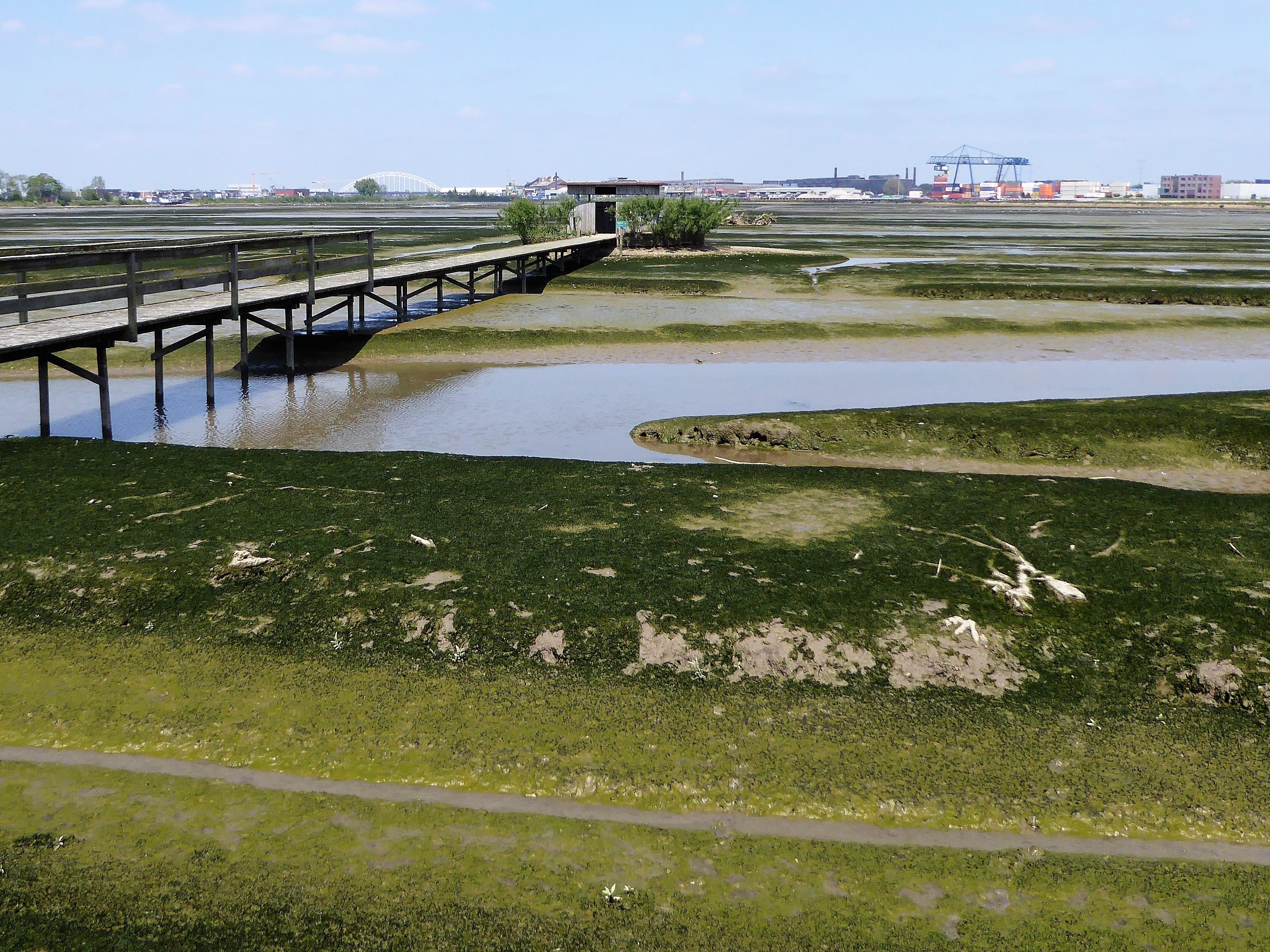 Verder, het eiland rond. Dat gaat niet helemaal, halverwege moet je dwars doorsteken. Over honderden meters lange houten loopbruggen. Ik fotografeer een bergeend, een broedende zwaan laat me dichtbij komen, een kievit en de onvermijdelijke ganzen. Tja, ik heb wel eens eerder een vogel gezien. Wat het bijzonder maakt, is de combinatie. Verstilde natuurplaatjes ogenschijnlijk. Er is de constante grom van de binnenvaarders, de Fast Ferry heeft zijn eigen geluid en die heimachine in Papendrecht. Groene slikvlakte, de lage dijk en daarboven fabriekjes, hijskranen. Een koppel Canadese ganzen met een sleep van dertien jongen achter hen aan. Achter hen schuift een rij containers voorbij, Hapag Lloyd en Maersk. Op de smalle vlonder kan ik niet ontsnappen, Vogelaar komt er aan:
