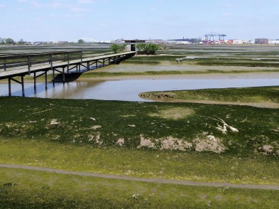 Vogelaar blijkt linksaf te gaan, dus ga ik rechts een smal dijkje op, waar 327 miljoen muggen wonen. Het is in alle opzichten een vreemde plek. In feite een omdijkte modderplaat die niet toegankelijk is, drijfzand. En daarop scharrelt allerlei gevogelte. Interessant ongetwijfeld, mij gaat het meer om deze onontdekte plek. Jammer dat Vogelaar er is, anders had ik dit eiland voor mezelf. Op de uiterste punt is een verhoging, dat zal de plek van de galg geweest zijn. Eronder, achter de muur staan bankjes waar uitbundige brandnetels doorheen groeien. Als ik stil zit, gaat het net. Lekker uit de wind, recht voor me de contouren van Dordt. Een constante rij van binnenvaartschepen vlak langs. Perfecte hangplek.
