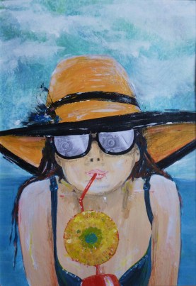 Er schuiven ruwhouten planken voorbij met merkwaardig schaaldiervlees, de onvermijdelijke sushi en Italiaanse scharrelvleeswaren. Hier geen kroketten, zelfs geen vette Kwekkeboom. Ik vis de groente uit mijn mojito, die alcohol vrij is, volgens mij ook geen pillen erbij en toch zweef ik verder. Is dit Ibiza of toch Curaçao? In ieder geval zijn het dezelfde vriendelijke witte wolkjes in het blauw. Ben ik high of slaap ik. De DJ knoopt de nummers naadloos aan elkaar. De gouden bikini schuift langs en die bikini blijkt verrassend klein. De duckface gaat verzitten en blijkt ouder dan gedacht. Ginds krijgt een sportschoolbody een smeerbeurt. Een koele zucht strijkt mijn rug. Buiten buitelt een parasol en bedekt de zonnebaadsters. Het tafelt kantelt met medeneming van drankjes, telefoons, tasjes, sunmilk, alles. Beachboys herstellen lachend de chaos. Iedereen = een celeb.
