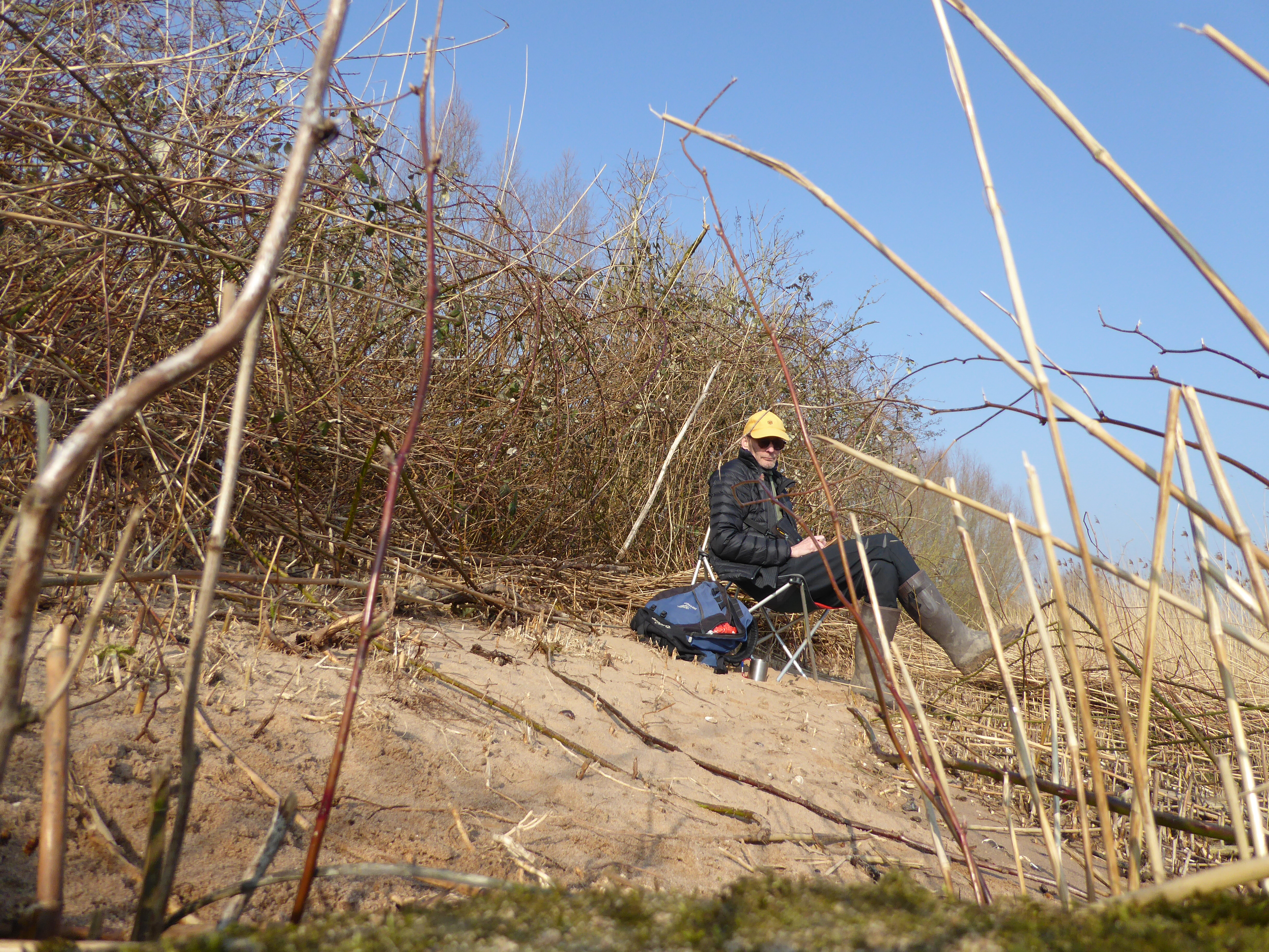 Het zal zo ongeveer precies in het midden zijn, tussen de Oost- en de Zuidhaven, waar ik de stoel vond. Net daar, waar ik toch al wilde gaan kijken wat ik die ochtend tussen mijn boterhammen had gedaan.(kaas natuurlijk) Ik kiepte het reeds verzamelde afval in de groene afvalbak. En daar achter de bak die wankel op de pootjes stond, de hoge waterstanden hadden het zand weggespoeld, stond de stoel. Zo’n moderne, uit- of inklapbare outdoor wildernis stoel. Ik ploegde me door het toch al geknakte riet naar de andere kant van de strekdam. Volstrekte luwte en uit het zicht van die enkele man-met-hond of die verrekte vogelaar. Eerder was ik al een hond tegengekomen, een van de 1,5 miljoen honden die ons land rijk (nou ja, rijk) is. Pas nadat de baas het grommende ondier in bedwang hield kon ik verder. Nu hier, stilte, zon en 1 of 2 graadjes boven nul.