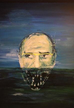 Mijn schilderij heeft niets met deze tentoonstelling te maken. Er is nog een andere evenement gaande: ‘De Vier zonen van Dordrecht’. Ter herdenking van het geboortejaar, 1918, 100 jaar geleden, van Cees Buddingh’- dichter, Otto Dicke – tekenaar, Kors Monster – componist en Aart Alblas – verzetsstrijder. Een mooi thema voor lezingen en voor ons als schilders van Barteljee. Natuurlijk koos ik Buddingh’ en combineerde zijn eigen markante hoofd met een creatie van hem, een gorgelmonster. Die foto is zo gemaakt en ik moet me bedwingen om niet meer foto’s te maken. Naast de Statenbijbelvitrine zitten drie jongemannen aan tafel. Laptops, boeken, schrijfblocs. Ze studeren. Dat is niet zo vreemd in een bibliotheek. Wat ik fantastisch vind: ze hebben duidelijk een allochtone achtergrond. Best wel waarschijnlijk Nederlands, keurig geknipt donker haar, twee five o’clock shadow en een met volle baard. Praten zacht en beschaafd. Studeren misschien Communicatiewetenschappen of International Business.