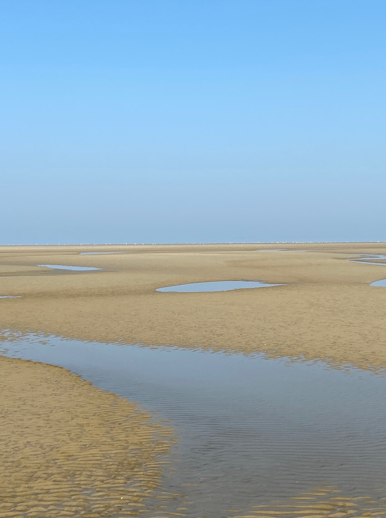 Gezeten op zijn olijfgroene Batavus Torino, bj. +/- 1982, trapte hij voorwaarts, schelpjes als het wadslakje, het zaagje en tepelhorentje knerpten onder zijn wielen. Wegens het ontbreken van wind zeilde hij met hoge snelheid verder. Of was het de hunkering, het verlangen om snel daar te zijn die en dat hem deed pompen op de pedalen. En het leek slechts even later dat hij bemerkte aan het zand tussen enkele tenen: Hee, kennelijk heb ik mijn schoenen uit gedaan. Na een gedachteloze voettocht naderde hij de verre einder, de rand van het strand, want daar was het, weten jullie, waar hij tot stilstand kwam, lichamelijk en gelijktijdig geestelijk leeg, aan de vloedlijn. En jawel, de omstandigheden waren goed, ten eerste het tij, de zee was op dat moment bijna op zijn verst teruggetrokken. En verder, geen wind, dus geen golven, geen geluid. De zee was nu letterlijk zo vlak als een meer en lag daar stil te spiegelen. Geen wolken en geen wind, de zon die in dit jaargetijde niet zo hoog kon klimmen scheen met een bepaalde heiigheid, waar zee en water elkaar ontmoetten, dat bleef onzichtbaar.