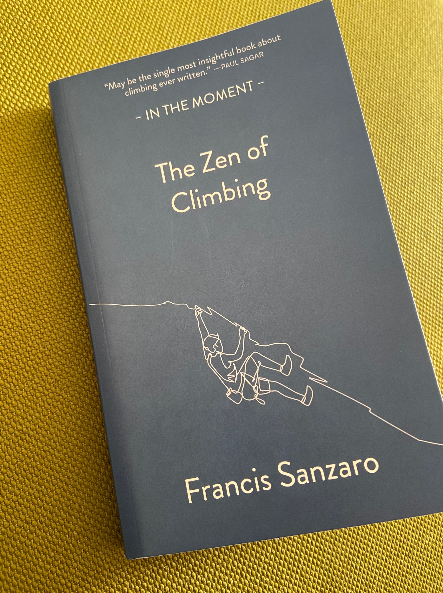 Zojuist het boek dichtgeslagen; ‘The Zen of Climbing’ van Francis Sanzaro, dat ik zo snel mogelijk probeerde te lezen. Wat overigens niet meeviel, ik moest nogal eens een woord inspreken in de vertaalapp. Het is misschien een ietwat zweverig onderwerp; Zen en dan ook nog eens in het Engels, best lastig om het goed te begrijpen. Hooguit een paar hoofdstukken per keer kon ik lezen.