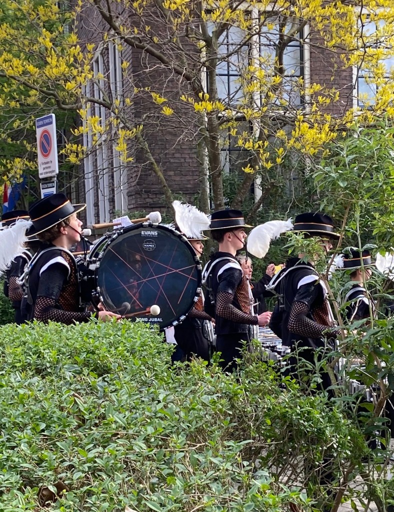 Precies, dat woord zocht ik. Toen ik terugfietste uit de stad waar de gekte al in volle hevigheid was losgebarsten en ik nog hele volksstammen gehuld in oranje kleding die het midden hield tussen carnaval en de hel tegenkwam op weg erheen. Naar het nationale volksfeest dat Koningsdag heet en verworden is tot een grote landelijke rommelmarkt. Ik had mij naar het centrum gehaast, niet naar de aubade, oh nee, dat nooit, maar om ze weer eens te zien, Jubal. Het showkorps met het trompetgeschal en de trommels met hun kippenvel veroorzakende onnavolgbare ritmes en de meisjes voorop met hun zwaaiende vlaggen die in de nauwe straten in de oude stad voor haast Fellini-achtige sfeerbeelden oproepen. Helaas, zo vertelde een oranje mevrouw me dat Jubal niet meer bestaat. Wat ik zag was een flauwe afspiegeling, Jong-Jubal. Een groepje jonge kinderen die hun best deden.