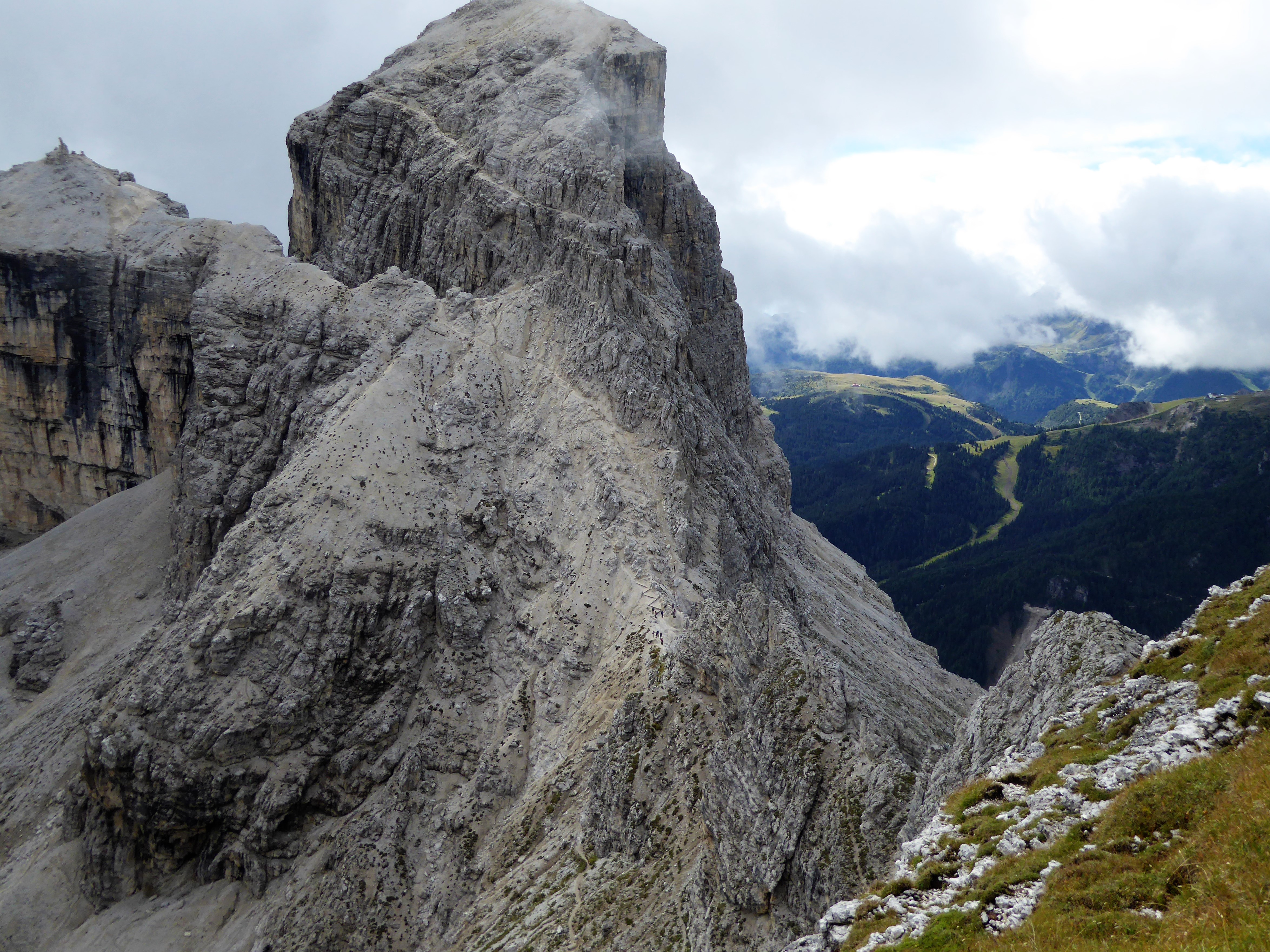 Niet alleen om te voorkomen dat mijn pet wegwaait maar ook voor de kou; waar is die muts nu? Op de bodem van de rugzak. Hier bovenop de Sella is het steenkoud. We reden met de auto het massief rond, 37 haarspeldbochten van Passo Gardena naar Passo Pordoi. Met de gek geworden Italianen op motoren en racefietsen is dat veel gevaarlijker dan bergbeklimmen. Hier is alles groen en is het niet te begrijpen dat we bovenop die afwijzende massieven lopen. Met de Funivia gondel zijn de achthonderd meter hoogteverschil zo genomen. Een uurtje nog naar Rifugio Piz Boe 2871m. Steeds minder dagjesmensen komen we tegen, de meesten gaan niet verder dan Rifugio Forcella dei Pordoi. Een kopje koffie en snel weer naar beneden. Wij ronden Piz Boe 3152m., de merkwaardige punt bovenop het massief. Een van de makkelijkste drieduizenders, slechts een kleine driehonderd meter boven de hut. Het is nog vroeg en Riem wil persé meteen dat topje pakken. Ik ben blij dat ik bij de hut een plekje uit de wind kan vinden en verschuil me achter mijn halve liter.
