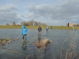 Bij het pompgebouwtje Hooge Hof worden de fietsen geparkeerd. We gaan het dijkje op en zien alleen maar water. De hele voormalige polder Hooge Hof staat onder water. Waar is de brug gebleven? Te Hoge Waterstanden. De brug van 35 meter lengte ligt onder water. En wie is tegenwoordig nog in het bezit van rubberlaarzen. Rienk (broer) en ik, dat behoort tot onze PSU – Persoonlijke Standaard Uitrusting – en steken gewoon over. Jan, Elwin wagen het op hun bergschoenen, op de tenen lopend klotst het water net niet langs de sokken. Kees heeft zijn gamaschen heel strak over de schoenen, er blijkt geen water onder door te kunnen. Rienk loopt terug met mijn laarzen en daarin komt ook Kerstin droog over. Maar hoe pakt Rivierenlandvoorzitter Robert het aan. Blootvoets steekt hij over, het water is net boven het vriespunt, het brugdek zo’n open rooster van metaal. Hij geeft geen krimp, lachend haalt hij het. De voorzitter, een voorbeeld voor den Jeugd.