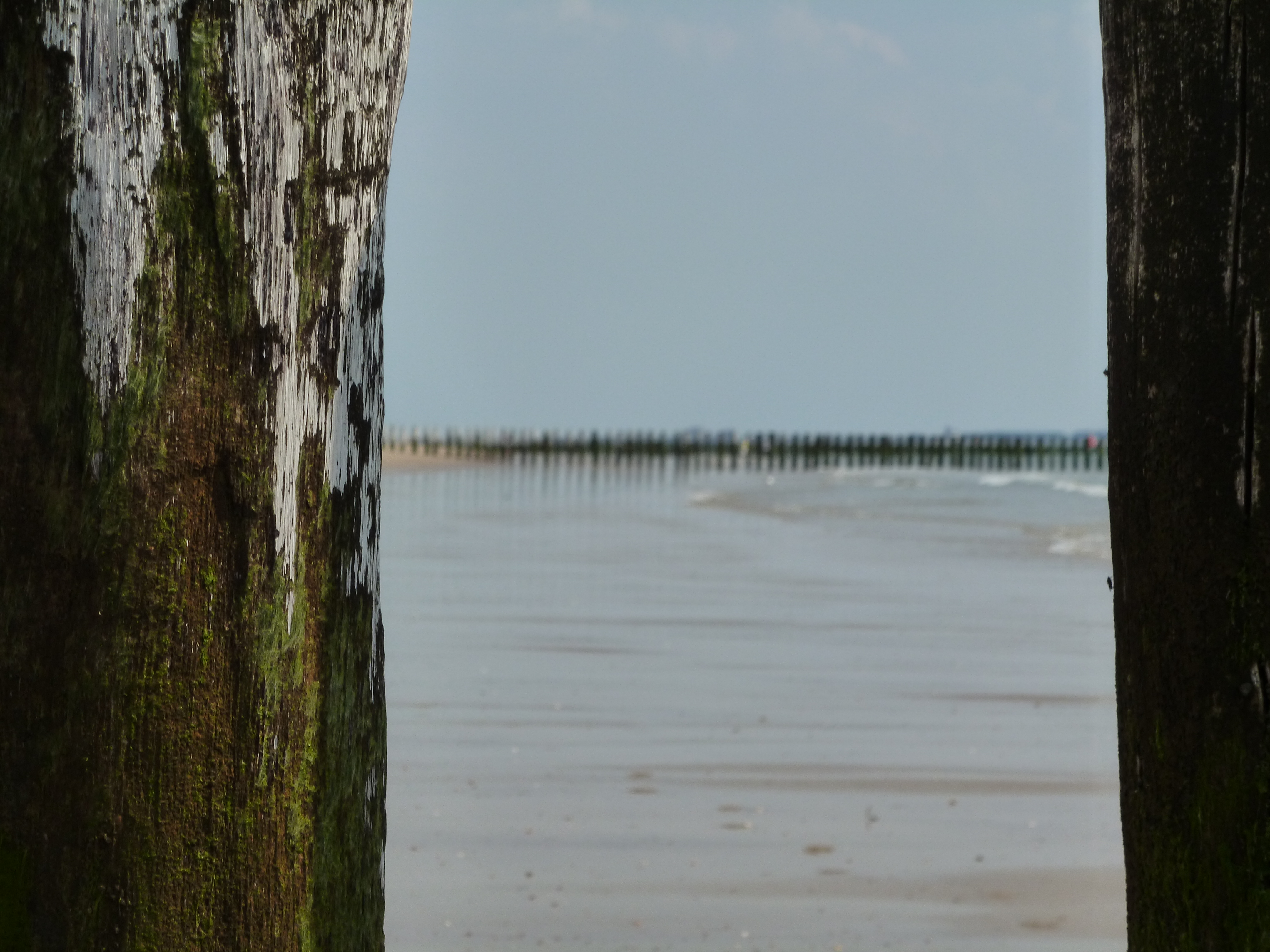 In de huizen op de boulevard, de zon staat plat op de typische badplaatsgevels, zien we slaperige, ongeschoren mannen aan de koffie. Geen gordijnen, veel verrekijkers op statief voor de ramen. Bladderende kozijnen, verweerd glas, duidelijk de invloed van de zoute zee. In het strandhotel waar we binnen vallen voor een snelle kop koffie verbazen de ontbijters zich duidelijk over onze wandeldrift. Verderop ruiken we de speciale lucht van geïmpregneerde houten palen die liggen te wachten om als golfbreker te gaan fungeren. Bij een – nog stil – achter de duinen gelegen strandtent laadt de eigenaar zijn voorraad uit de kofferbak van zijn middenklasser. Het pad voert ons nu over de top van zeer hoge duinen, van waar we een groot deel van Walcheren kunnen zien liggen. Tussen de met zwarte meidoornstruiken omzoomde weggetjes zijn de akkers en weilanden gevuld met ochtendmist. Veel huizen zijn voor de helft van rode baksteen en de andere helft bestaat uit een zwartgeteerd schuurgedeelte. Daarin de keurig witgeschilderde ramen en deuren. Vanuit de diepte zwaait een vut echtpaar dat ons hoort praten en ziet wijzen. Aan de zeezijde staat een grafisch geraamte van het palen en balken onderstel van een verdwenen strandtent, waar de lage zon mee speelt.