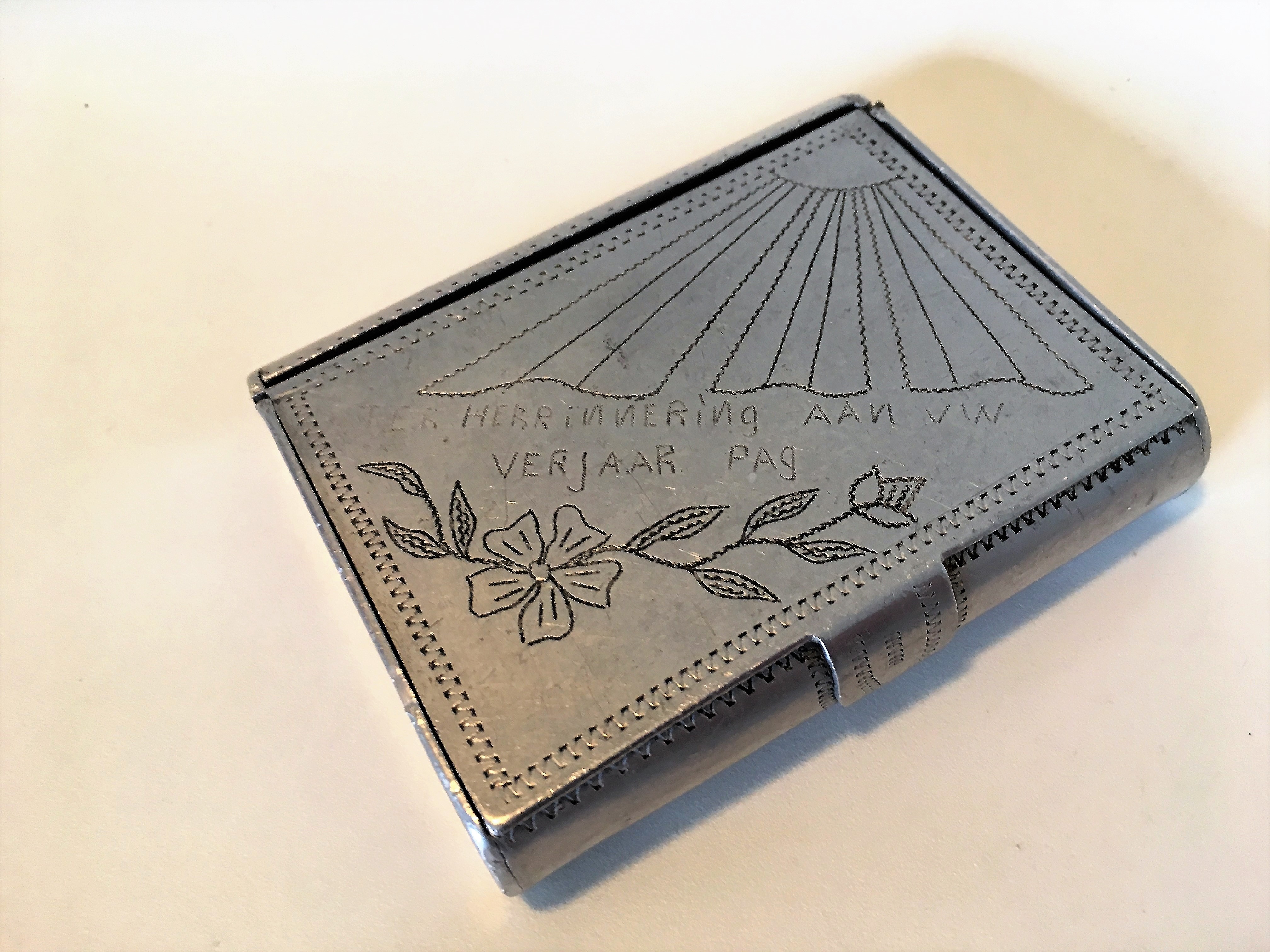 Er waren Russen, witrussen, noemde Pa hen. Met een van hen was hij bevriend. Van hem kreeg hij een zelfgemaakt metalen sigarettendoosje. Dat doosje is voor mij een dierbare herinnering aan Pa. Het staat op zijn vaste plek op de kast. Het deksel is versierd met ingehamerd reliëf. Een zon met schuine stralen en een bloemenrank. In hanenpoten is een tekst ingekrast: ‘ter herinnering aan uw verjaarpag’. De N nen staan verkeerd om en de d van dag is een p. Op de achterkant van het doosje staat in een grote letters: